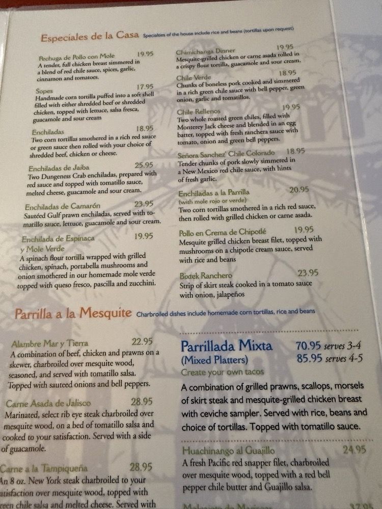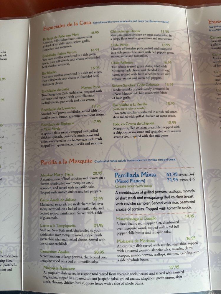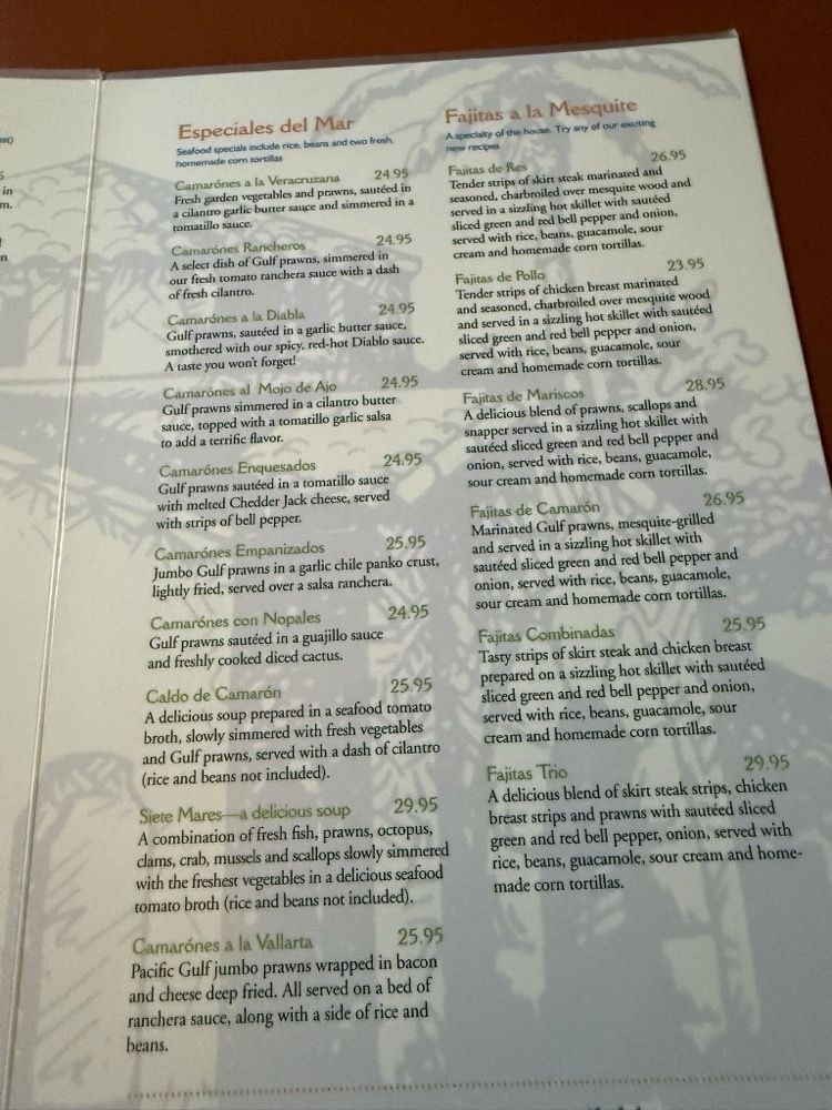 Marinated Gulf prawns, mesquite-grilled and served in a sizzling hot skillet with saut-ed sliced green and red bell pepper and onion, served with rice, beans, guacamole, sour cream and homemade corn tortillas.